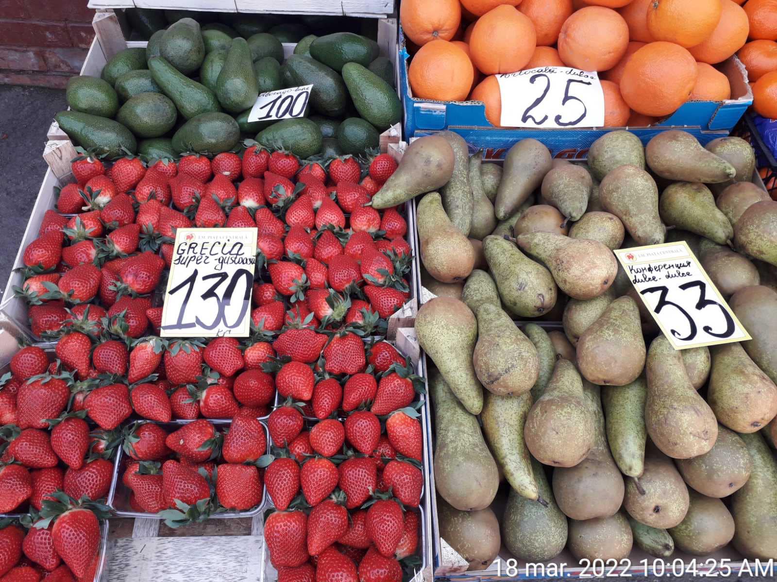 Referitor la fructe: prețul unui kilogram de mere variază între 6 și 8 lei, strugurii – 15 lei, un kg de lămâie costă 20 de lei, un kg de pere – 33 de lei, iar un kg de avocado – 100 lei. Totodată, un kg de căpșune aduse din Grecia costă 130 lei.