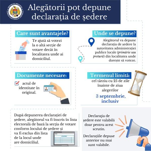 Primăria Municipiului Chișinău amintește cetățenilor cu drept de vot că, până pe 3 septembrie 2025, își pot declara noul loc de ședere la organul administrației publice locale (pretura de sector sau primăria locală, în cazul suburbiilor), dacă după ultima participare la alegeri și-au schimbat locul de ședere.