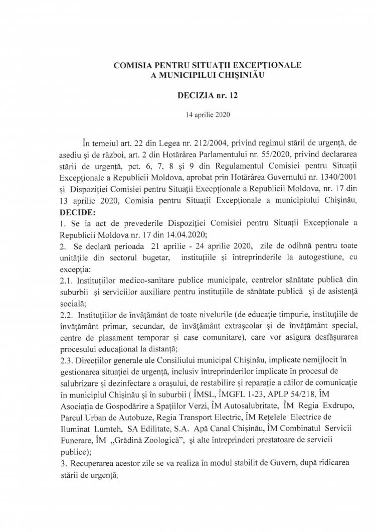 Decizia nr. 12 a Comisiei pentru Situații Excepționale a municipiului Chișinău De către AloCapitala - aprilie 14, 2020 0 671 FacebookTwitterPinterestWhatsApp chisinau.md Advertisement