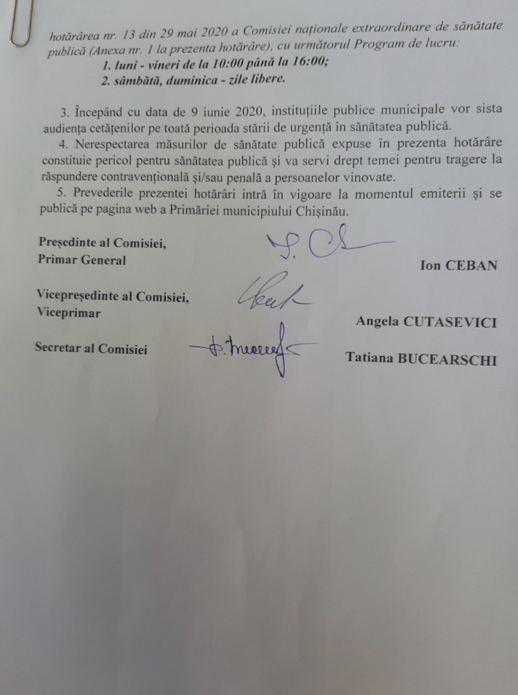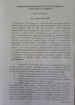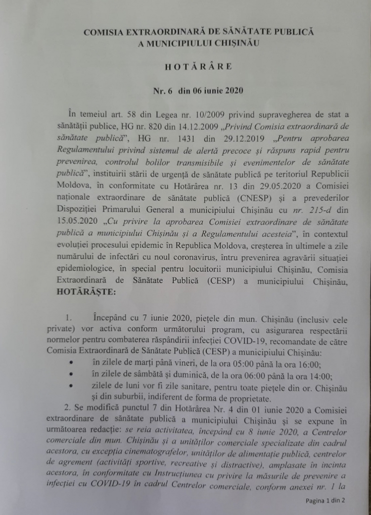 Hotărârea nr. 6 din 06.06.2020 a Comisiei Extraordinare de Sănătate Publică a municipiului Chișinău