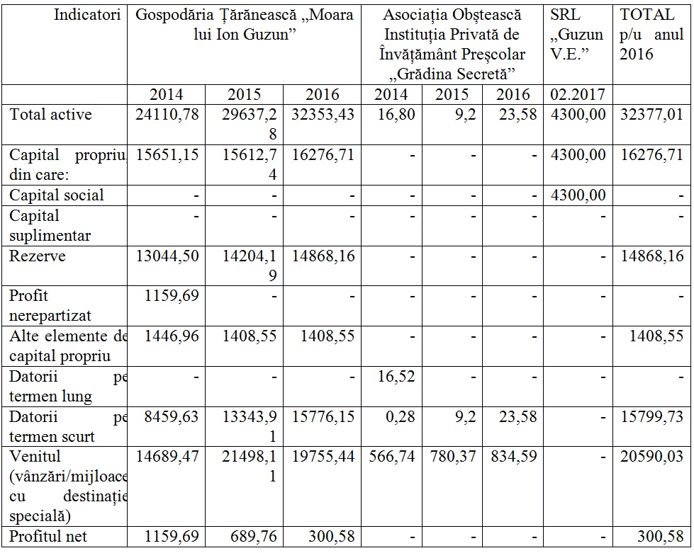 Analizând documentele anexate la oferta depusă de către Asociația Persoanelor Juridice, constatăm că SRL „Guzun V.E.” nu dispunea de active, iar indicatorii financiari pentru anul 2016 ai Gospodăria Țărănească „Moara lui Ion Guzun” și Asociația Obștească Instituția Privată de Învățământ Preșcolar „Grădina Secretă” au constituit: venitul din vânzări – 20,59 mil. lei, și profitul net – 0,3 mil. lei, cu o rentabilitate a veniturilor din vânzări de 1,46%.