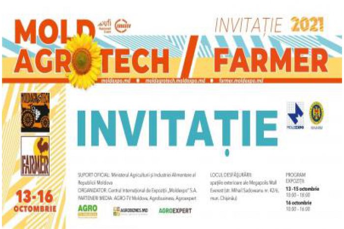Ministerul Agriculturii și Industriei Alimentare (MAIA) a anunţat astăzi că, în perioada 13-16 octombrie, se va desfășura o nouă ediție a Expoziției internaționale specializată de mașini, echipamente și tehnologii pentru complexul agroindustrial MOLDAGROTECH (ediția de toamnă) și a Expoziției internaționale specializate de produse, utilaje, tehnologii agricole și meșteșuguri FARMER.