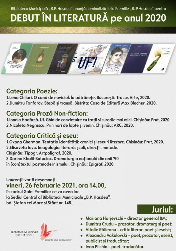 Biblioteca Municipală anunță nominalizările la Premiile „B.P. Hasdeu” pentru debut în literatură pentru anul 2020. Din componența juriului fac parte: