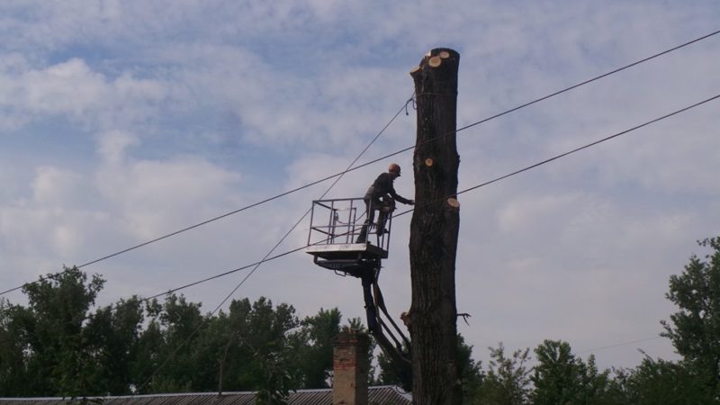 Executau lucrări de curățare cu turnul a arborilor de ramurile uscate, atârnate și rupte.
