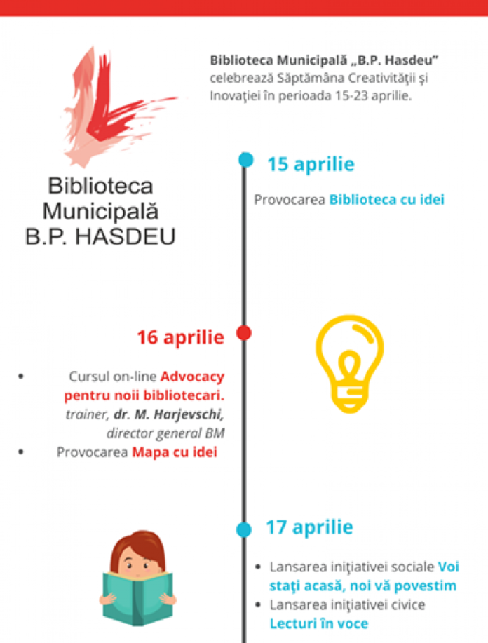 Programul Săptămânii creativității și inovației online al bibliotecii municipale „B. P. Hasdeu”, prevăzut pentru perioada: 15-23 aprilie, include ghidări online de acces și asimilare a conținutului cursului „Advocacy” lansarea inițiativei sociale „Voi stați acasă, noi vă povestim”; provocările: Sunt creativ, Obiectivele de dezvoltare durabilă; Premii și campioni, La o cafea etc.