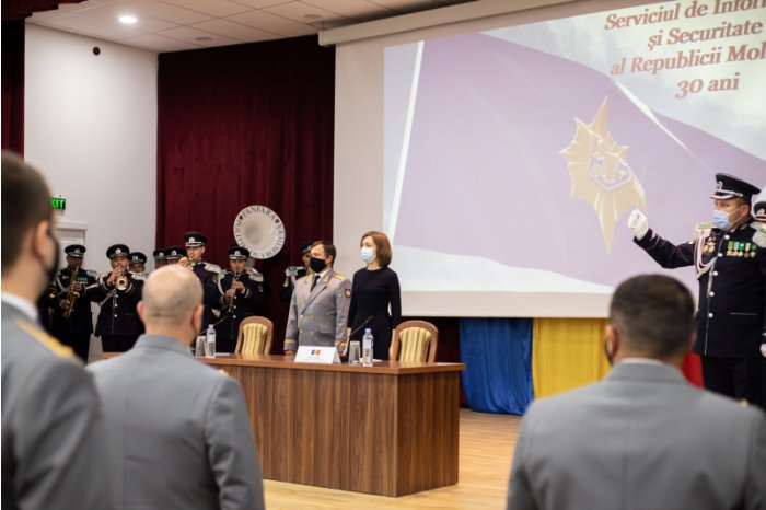 Președintele Republicii Moldova, Maia Sandu, a participat la evenimentul festiv, dedicat aniversării a 30-a a creării Serviciului de Informații și Securitate, precum și Zilei lucrătorului organelor securității statului, care este marcată astăzi.