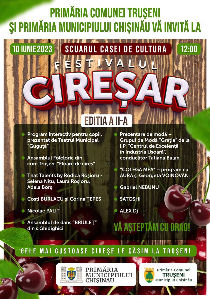 Primăria Chișinău, împreună cu Primăria Trușeni, organizează în 10 iunie cea de-a doua ediție a Festivalului ,,Cireșar”. Festivalul va avea loc în scuarul Casei de Cultură din Trușeni, începând cu ora 12.00.